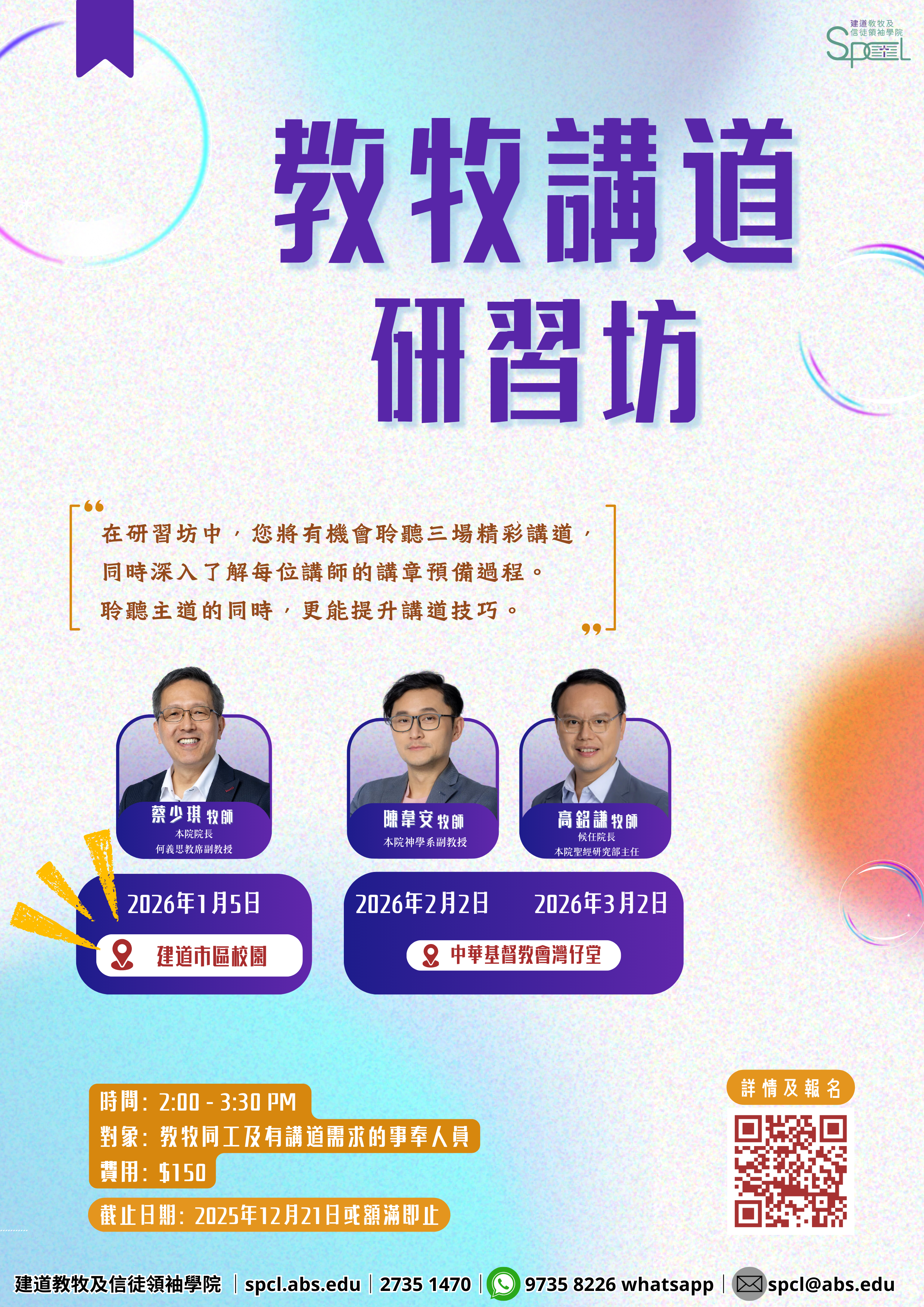 在研習坊中,您將有機會聆聽三場精彩講道,同時深入了解每位講師的講章預備過程。