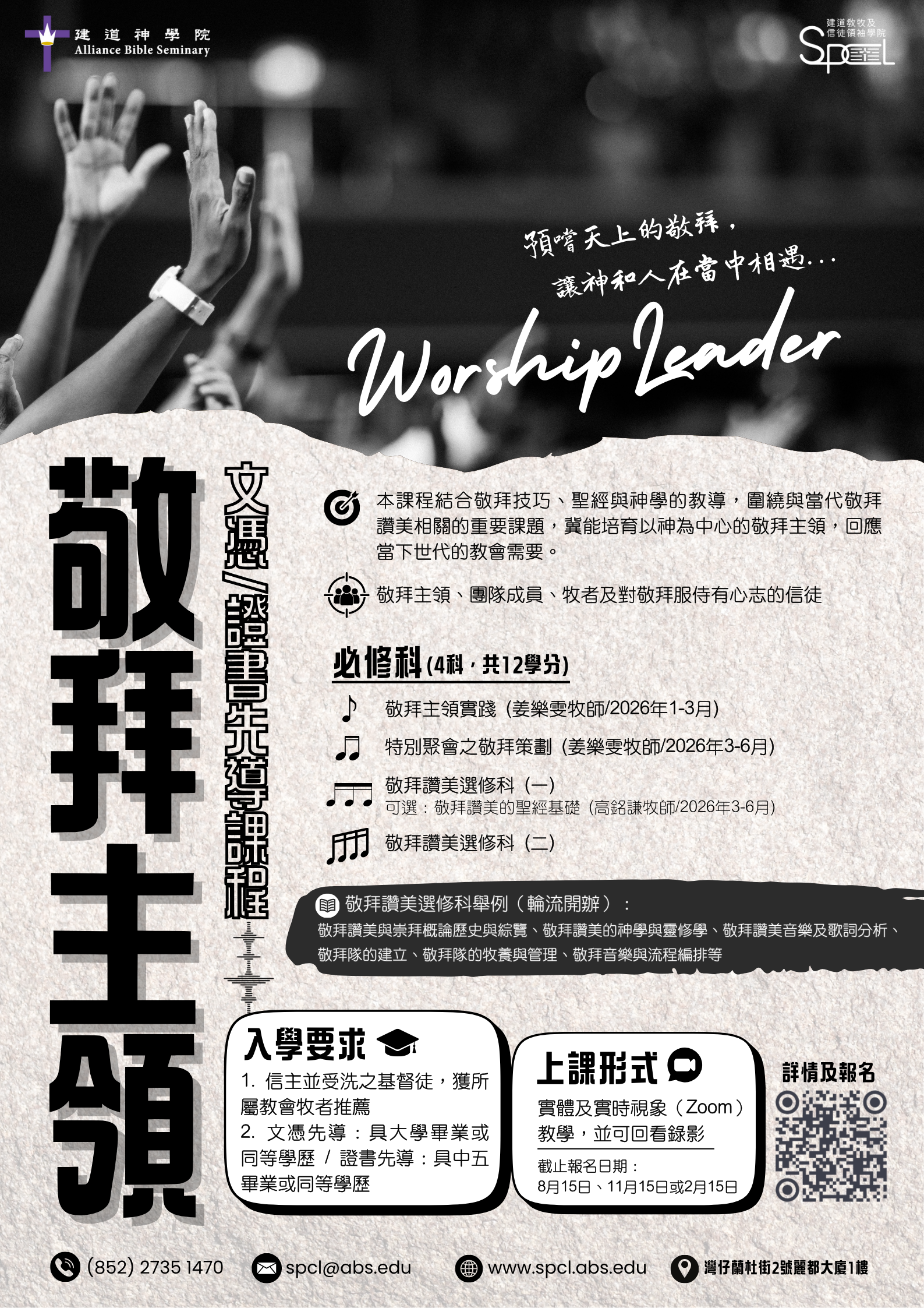 本課程結合敬拜技巧、聖經與神學的教導,圍繞與當代敬拜讚美相關的重要課題,冀能培育以神為中心的敬拜主領,回應當下世代的教會需要