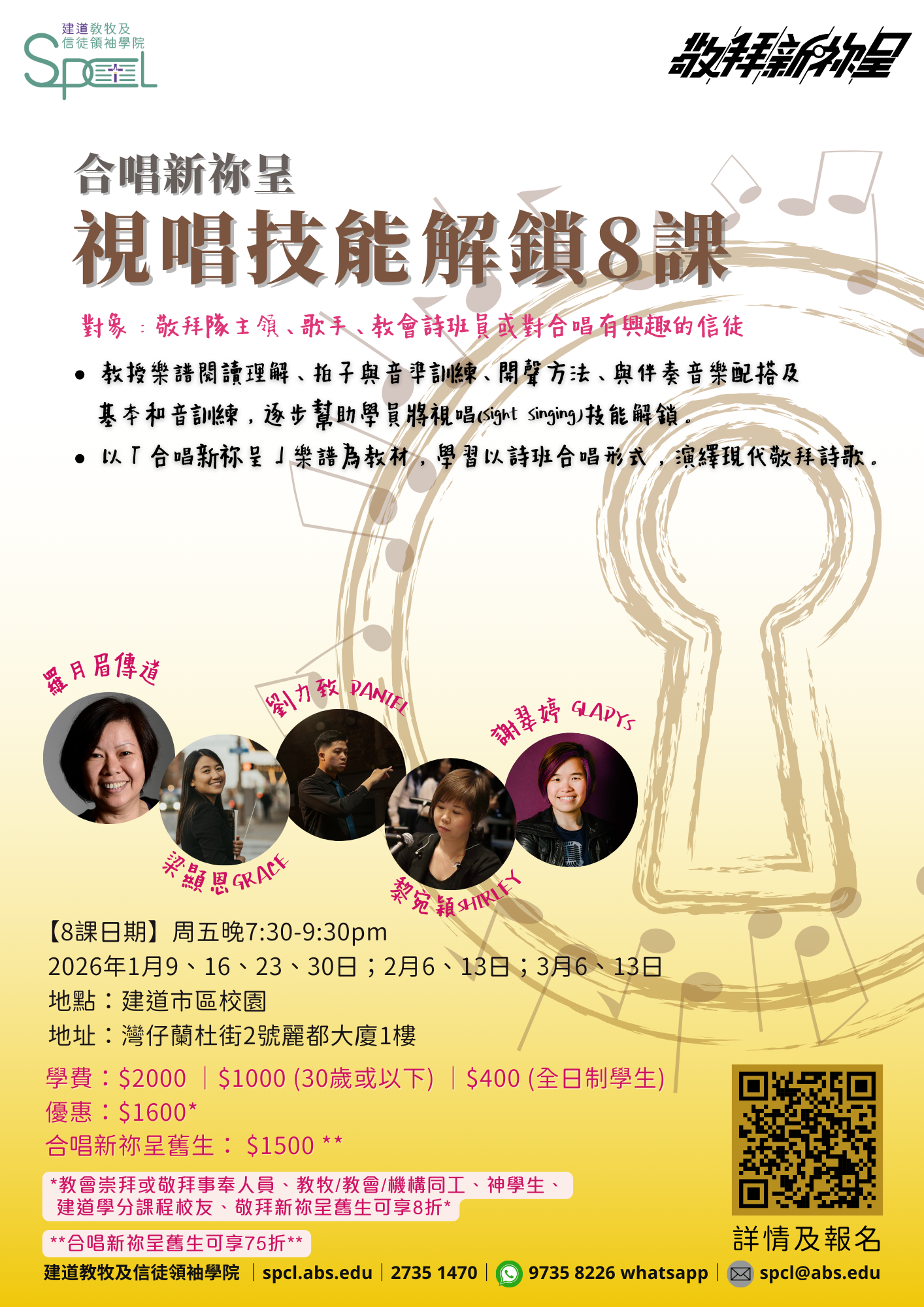 • 課程以「合唱新祢呈」樂譜為教材,學習以詩班合唱形式,演繹現代敬拜詩歌。